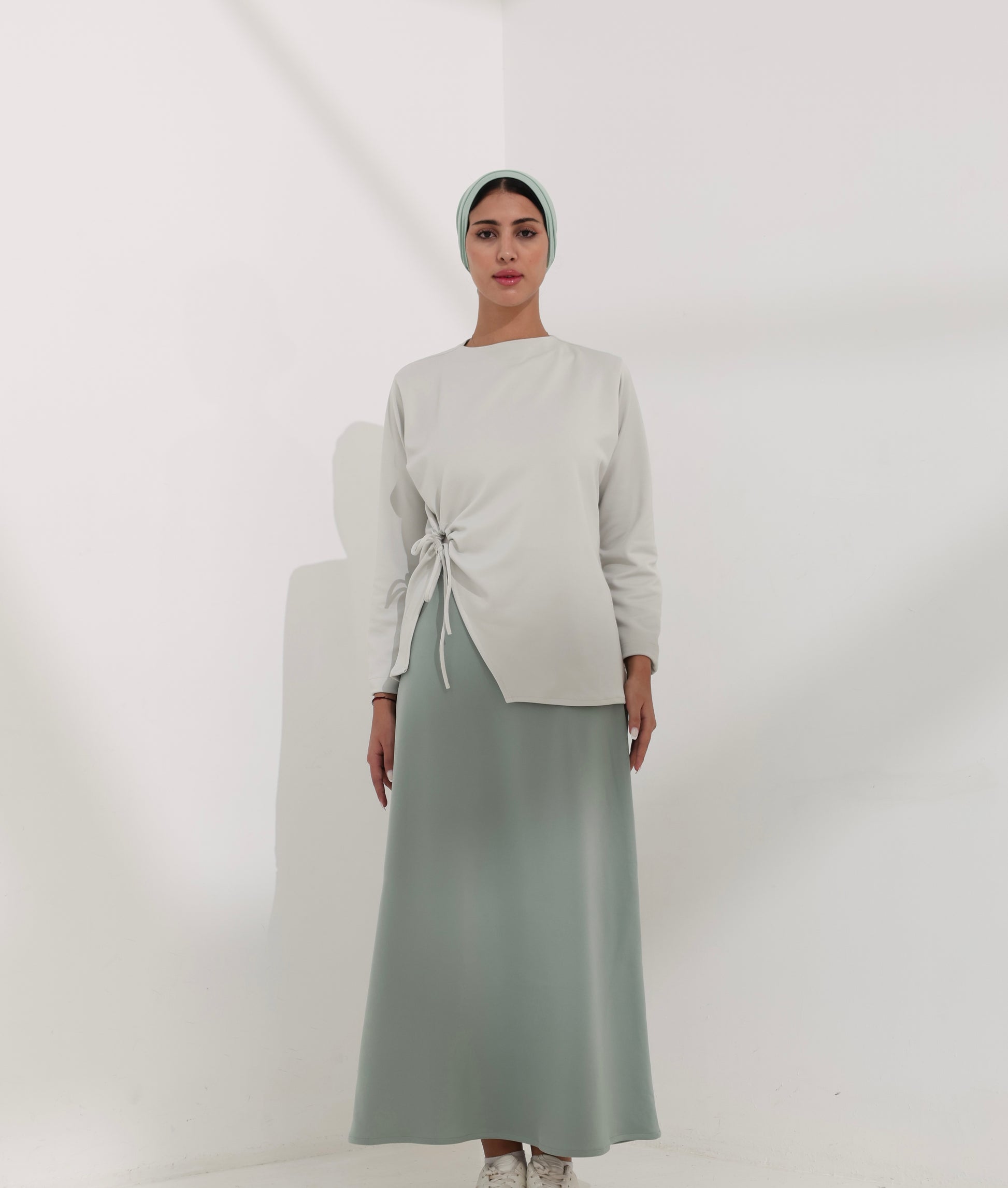 An elegant winter ensemble featuring an asymmetrical top with a delicate side tie, paired with a flowing skirt.